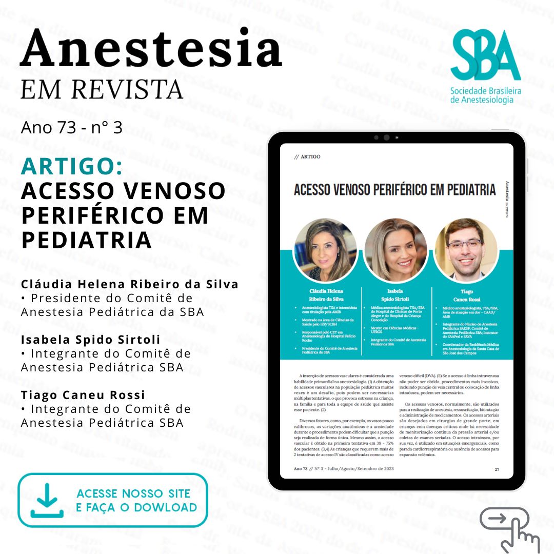 Download em PDF Clique aqui e associe-se agora à Sociedade Brasileira de anestesiologia e tenha acesso a esta publicação e outros conteúdos exclusivos. Artigo: Inteligência Artificial: Por onde caminhamos? Categoria: Anestesia em Pediatria Cláudia Helena Ribeiro da Silva- Presidente do Comitê de Anestesia Pediátrica da SBAIsabela Spido Sirtoli- Integrante do Comitê de Anestesia Pediátrica SBATiago Caneu Rossi- TSA/SBA.- Comitê de Anestesia Pediátrica –SBA 2024 Introdução: A inserção de acessos vasculares é considerada uma habilidade primordial na anestesiologia. A obtenção de acessos vasculares na população pediátrica muitas vezes é um desafio, pois podem ser necessárias múltiplas tentativas, o que provoca estresse na criança, na família e para toda a equipe de saúde que assiste esse paciente. Diversos fatores, como, por exemplo, os vasos pouco calibrosos, as variações anatômicas e a ansiedade durante o procedimento podem dificultar que a punção seja realizada de forma única. Mesmo assim, o acesso vascular é obtido na primeira tentativa em 39 – 75% dos pacientes. (3,4) As crianças que requerem mais de 2 tentativas de acesso IV são classificadas como acesso venoso difícil (DVA). (5) Se o acesso à linha intravenosa não puder ser obtido, procedimentos mais invasivos, incluindo punção de veia central ou colocação de linha intraóssea, podem ser necessários. Os acessos venosos, normalmente, são utilizados para a realização de anestesia, ressuscitação, hidratação e administração de medicamentos. Os acessos arteriais são desejados em cirurgias de grande porte, em crianças com doenças críticas onde há necessidade de monitorização contínua da pressão arterial e/ou coletas de exames seriadas. O acesso intraósseo, por sua vez, é utilizado em situações emergenciais, como parada cardiorrespiratória ou ausência de acessos para expansão volêmica. Clique no botão abaixo e leia o artigo na íntegra na Anestesia em Revista - Ano 2023 | Número 3 Leia a Anestesia em Revista na íntegra