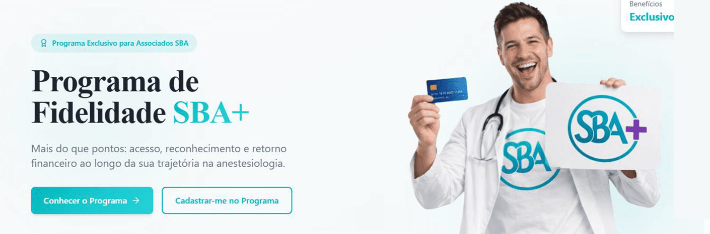Conhecer o Programa Cadastrar-me no programa Conheça o SBA+ O Programa de Fidelidade SBA+ é uma iniciativa da Sociedade Brasileira de Anestesiologia que valoriza e reconhece o compromisso dos associados com a educação e participação institucional, oferecendo acesso exclusivo, reconhecimento e retornos financeiros. Ele é baseado em Engajamento, Fidelidade e Reconhecimento, recompensando a participação ativa e a constância na associação. O que é o SBA+ Valorização da sua jornada profissional com benefícios progressivos. Como funciona o programa ? Sócio SBA acumula pontos enquanto faz suas atividades e ganha benefícios exclusivos, reconhecimento e retornos financeiros. Engaje-se, seja fiel e seja recompensado! Participe do Programa de Fidelidade SBA+ Em poucos passos, você ativa sua participação e começa a aproveitar os benefícios. Veja mais Regras gerais do programa Níveis de Classificação Nível 1 – Iniciante Critérios: Quem participa: Associados que pagaram a anuidade do ano vigente. Critério de Entrada: Pagamento da anuidade. Benefícios • Descontos em produtos SBA. • Sorteios para produtos SBA e inscrição em congresso internacional. • Acesso a conteúdos exclusivos da Academia SBА (Exclusivo para aspirantes). Nível 2 – Engajado Critérios: Critério de Entrada: Pagar anuidade por 2 anos consecutivos OU acumular 2.000 pontos no ano. Critério de Permanência: Pagar anuidade seguinte + manter padrão de pontos Benefícios • Sorteios mensais de cursos no Instituto SBA • Sorteio de inscrição no ASA (American Society of Anesthesiologists). • Sorteio de inscrição no ESAIC (European Society of Anaesthesiology). • Sorteio de inscrição no CBA Nível 3 – Fidelidade Critérios: Critério de Entrada: Pagar anuidade por 2 anos consecutivos OU acumular 3.000 pontos. Benefícios • Cashback: 25% do valor da anuidade para utilizar em produtos SBA. • Bem-estar: Desconto no Wellhub (antigo Gympass). • Segurança: Seguro de responsabilidade civil com desconto. • Educação: Curso de gestão na Academia SBA. Como acumular pontos Benefícios Exclusivos Onde utilizar minha pontuação Dúvidas rápidas